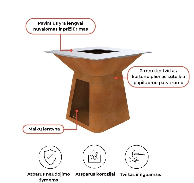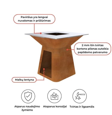 Kepsninė aukuras FIRESTORM L meistriškai pagaminta iš aukštos kokybės Corten plieno. Šis medžiagos pasirinkimas ne tik užtikrina didelį ilgaamžiškumą, bet ir suteikia kepsninei ypatingą eleganciją ir modernų stilių.